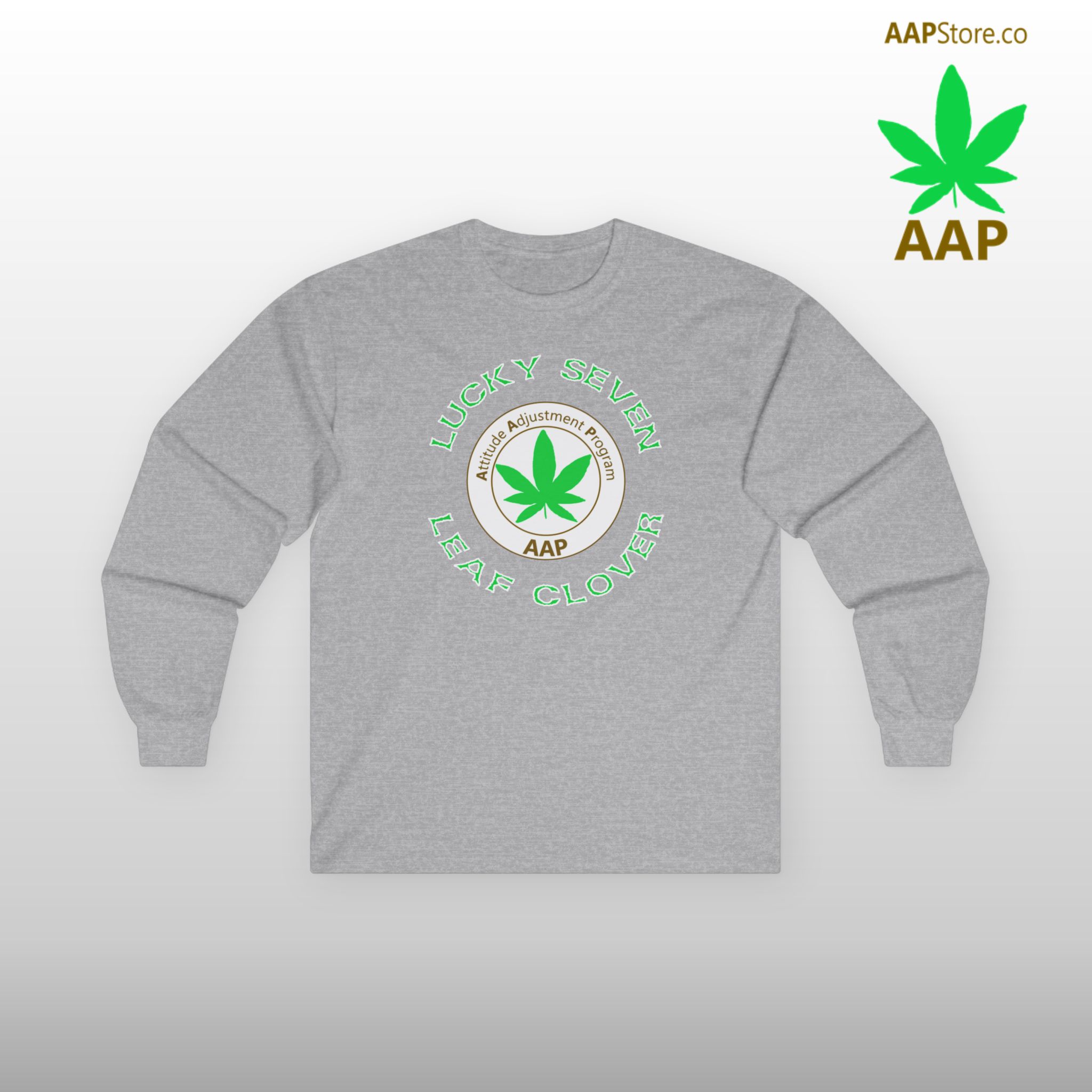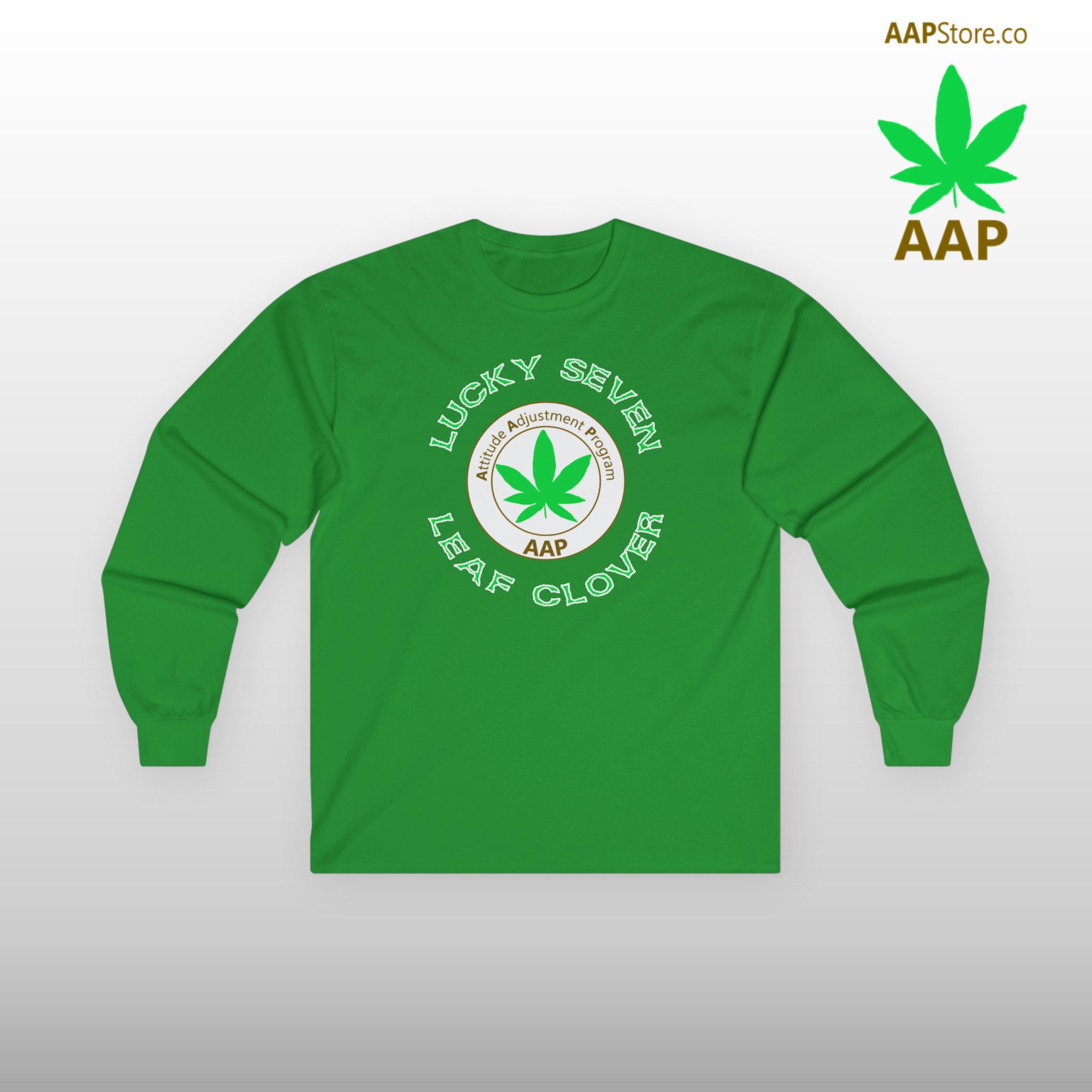 Celebrate St. Patrick’s Day the GREEN way if you know what we mean! Adjust your attitude with our AAP Original Lucky Seven Leaf Clover Long Sleeve Tee. Front large design plain back available in 4 colors and S/M/L/XL/2XL. Follow The Program. Attitude Adjustment Program. #FollowTheProgramAAP #AttitudeAdjustmentProgram #EverywhereStonerWear #LuckySevenLeafClover
