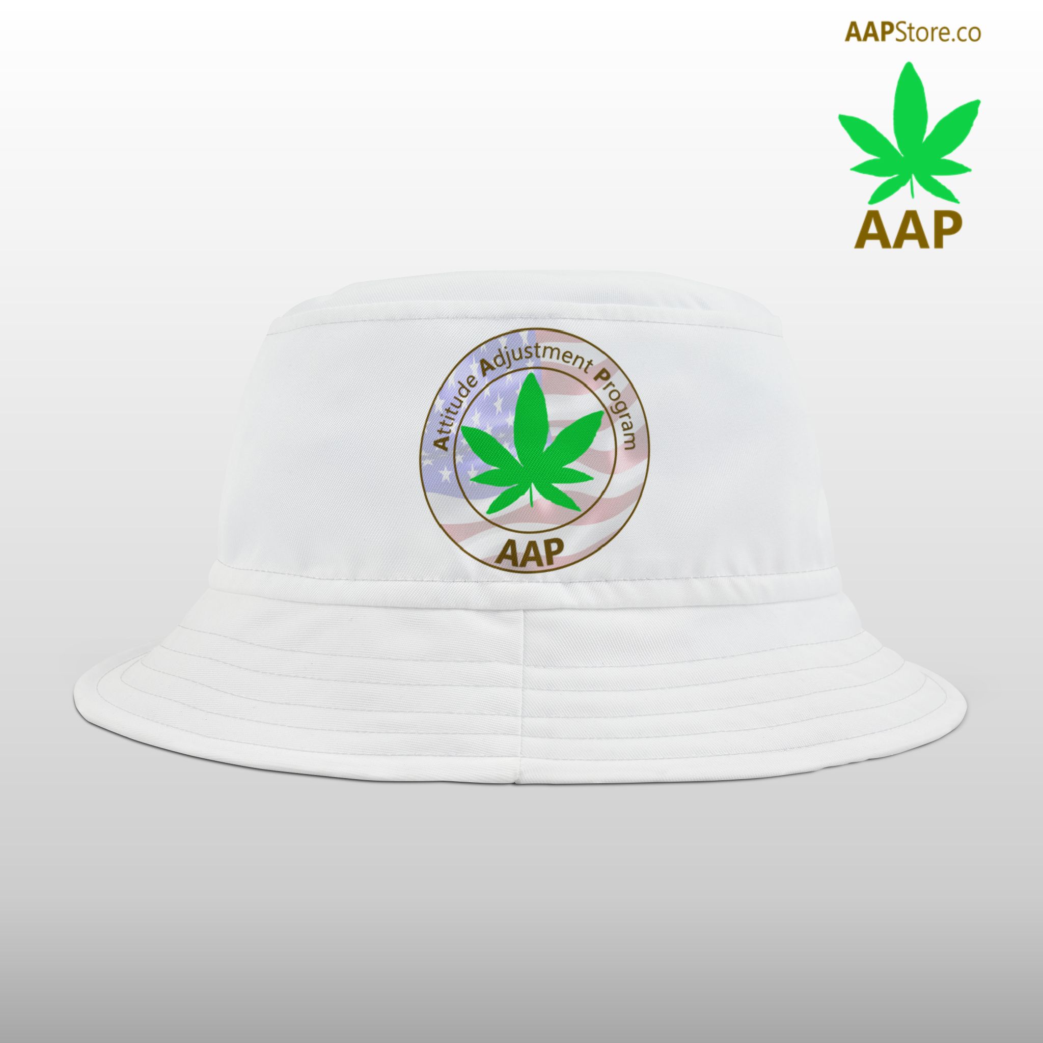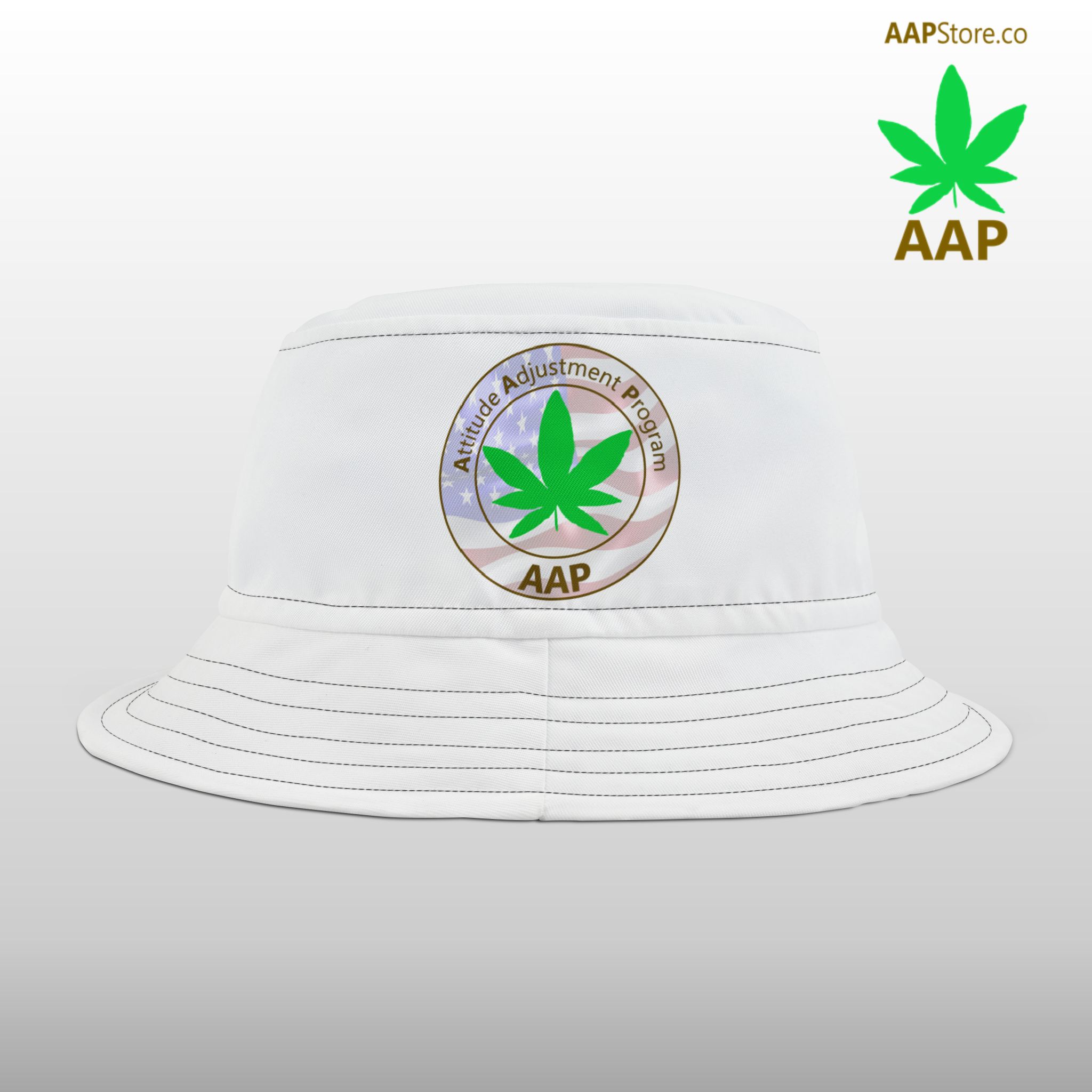 Puff It Up For Freedom and Follow The Program: Attitude Adjustment Program. Celebrate American Freedom year round wearing our Puff It Up For Freedom AAP Original White Bucket Hat. Front large logo, plain back design on White in 2 sizes with Black or White stitching.